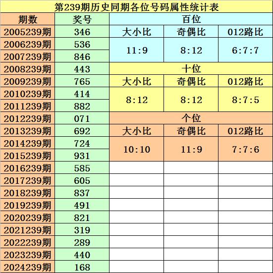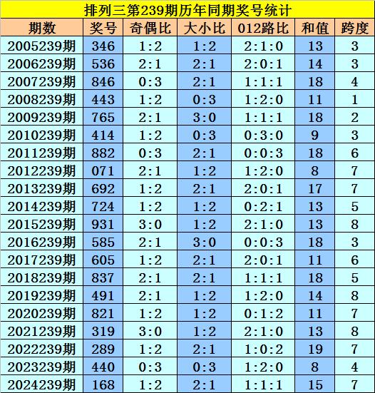 本期为排列三第2025239期开奖,历史上排列三第239期已开出了20期奖号了: